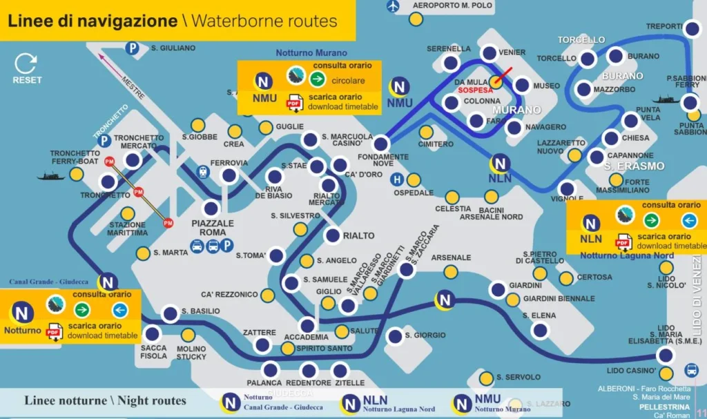 The Night Line is an experience in itself. It operates from roughly midnight until 5 AM. It follows a simplified route connecting the Train Station, Rialto, San Marco, and the Lido. Seeing the palaces illuminated and the water black and still is one of the most romantic things you can do in Venice—for the price of a standard ticket.