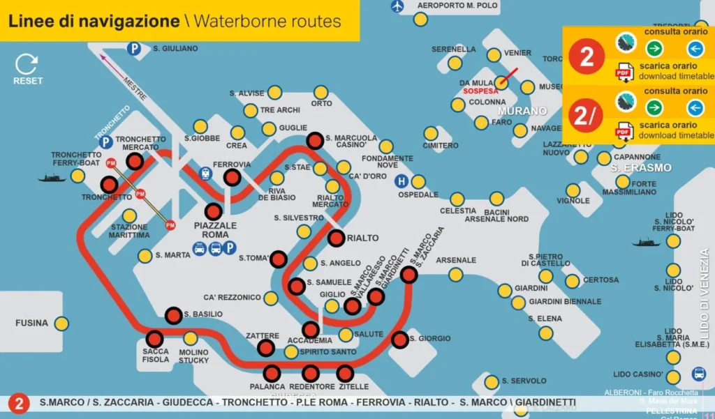 Line 2 is for the traveler on a mission. It skips the smaller stops like San Stae and Ca’ d’Oro, focusing on the major hubs. It is the fastest way to get from the parking at Piazzale Roma to the heart of the city.